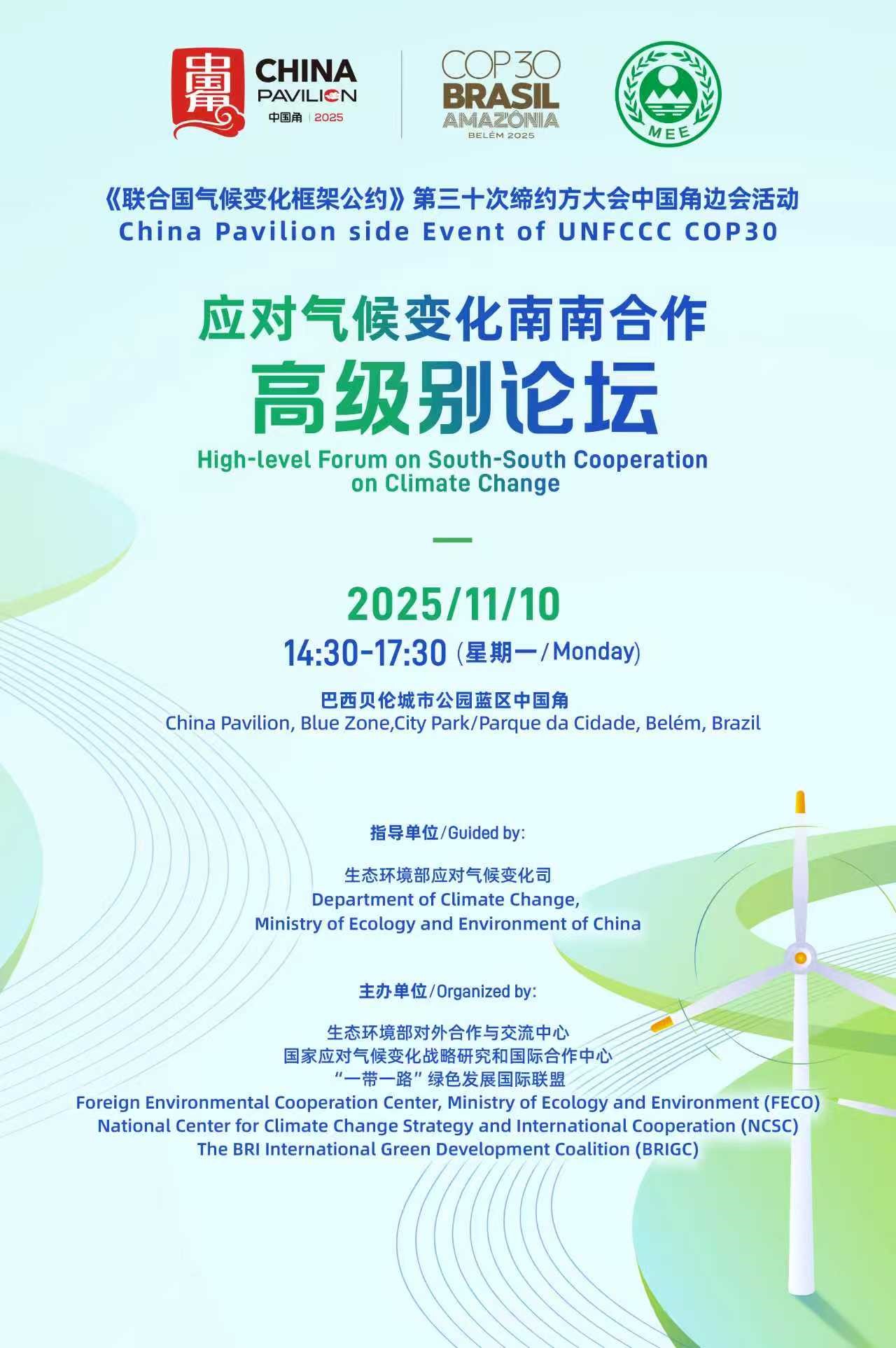 由生态环境部应对气候变化司指导,生态环境部对外合作与交流中心、国家应对气候变化战略研究和国际合作中心以及“一带一路”绿色发展国际联盟联合主办的第十三届应对气候变化南南合作高级别论坛,将于巴西当地时间11月10日(下午14:30—17:30)在COP30中国角举办。