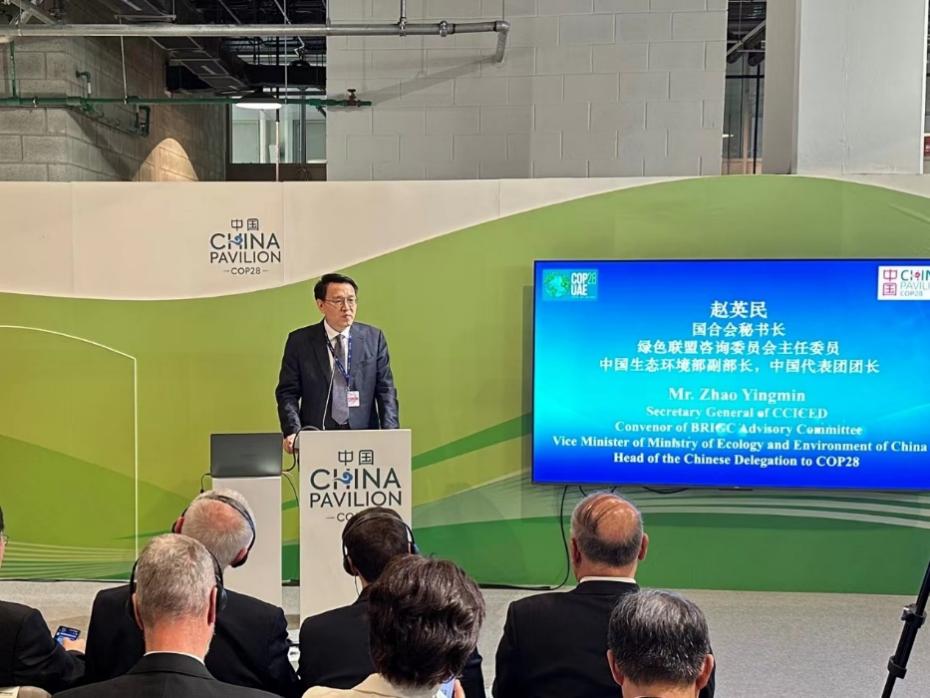 当地时间12月8日,中国环境与发展国际合作委员会(以下简称国合会)与“一带一路”绿色发展国际联盟(以下简称绿色联盟)联合举办的《联合国气候变化框架公约》第28届缔约方会议(COP28)中国角边会在迪拜举行,会议主题为“加强绿色发展创新合作,共建低碳、包容和韧性未来”。中国气候变化事务特使、国合会副主席解振华,生态环境部副部长、国合会秘书长、绿色联盟咨询委员会主任委员赵英民,加拿大环境与气候变化部副部长特伦布莱出席会议并致辞。